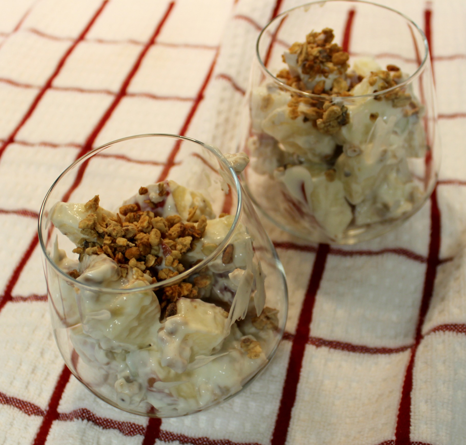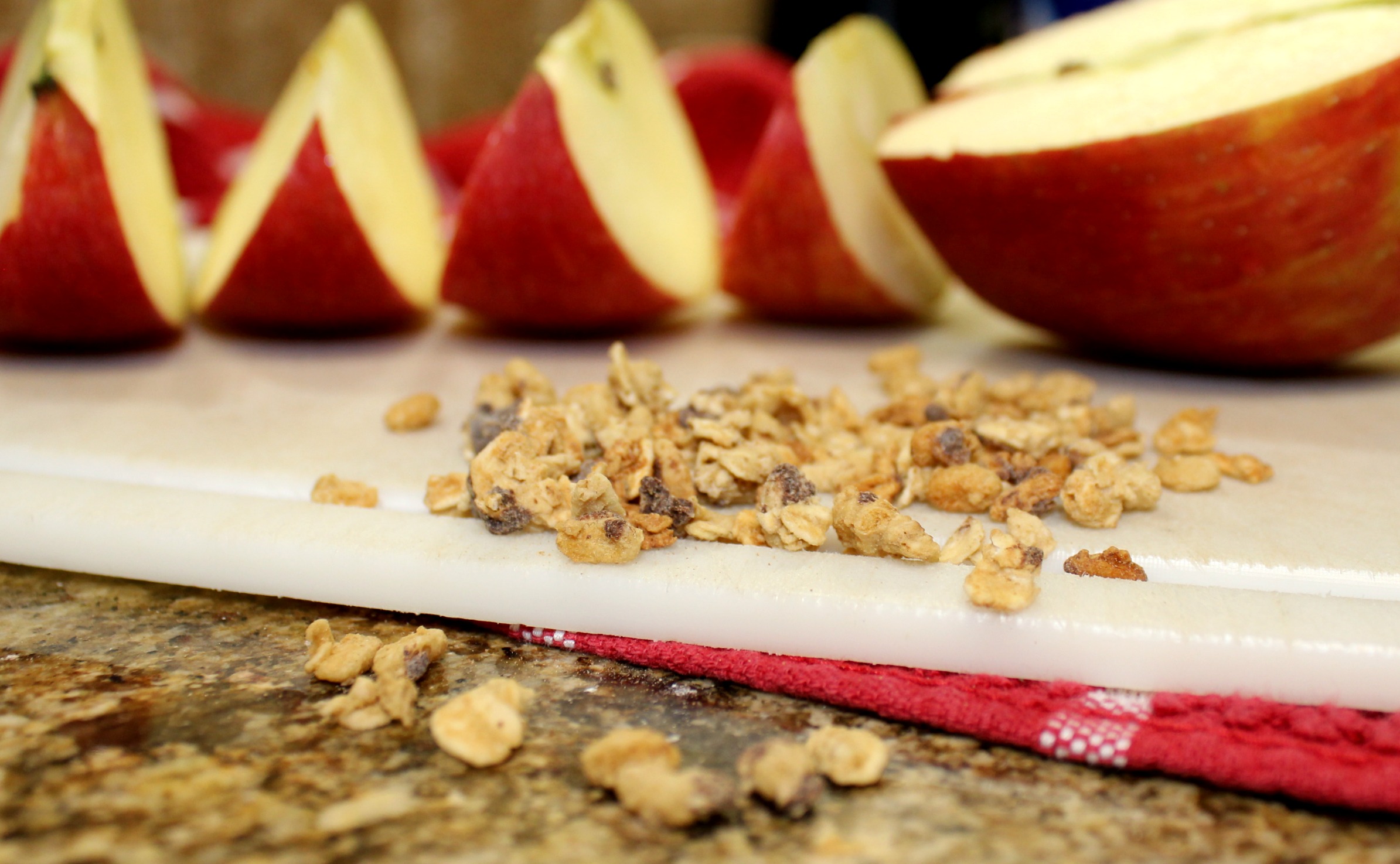 Rinse, slice and chop up apple into chucks, place in mixing bowl. Stir in yogurt and granola. Mix until apples are coated with yogurt and granola evenly. Sprinkle a little granola on top and then serve! Refrigerate any leftovers, the granola will get a little soggy eventually so make sure you eat it up fast! It’s so good you shouldn’t have any leftovers!